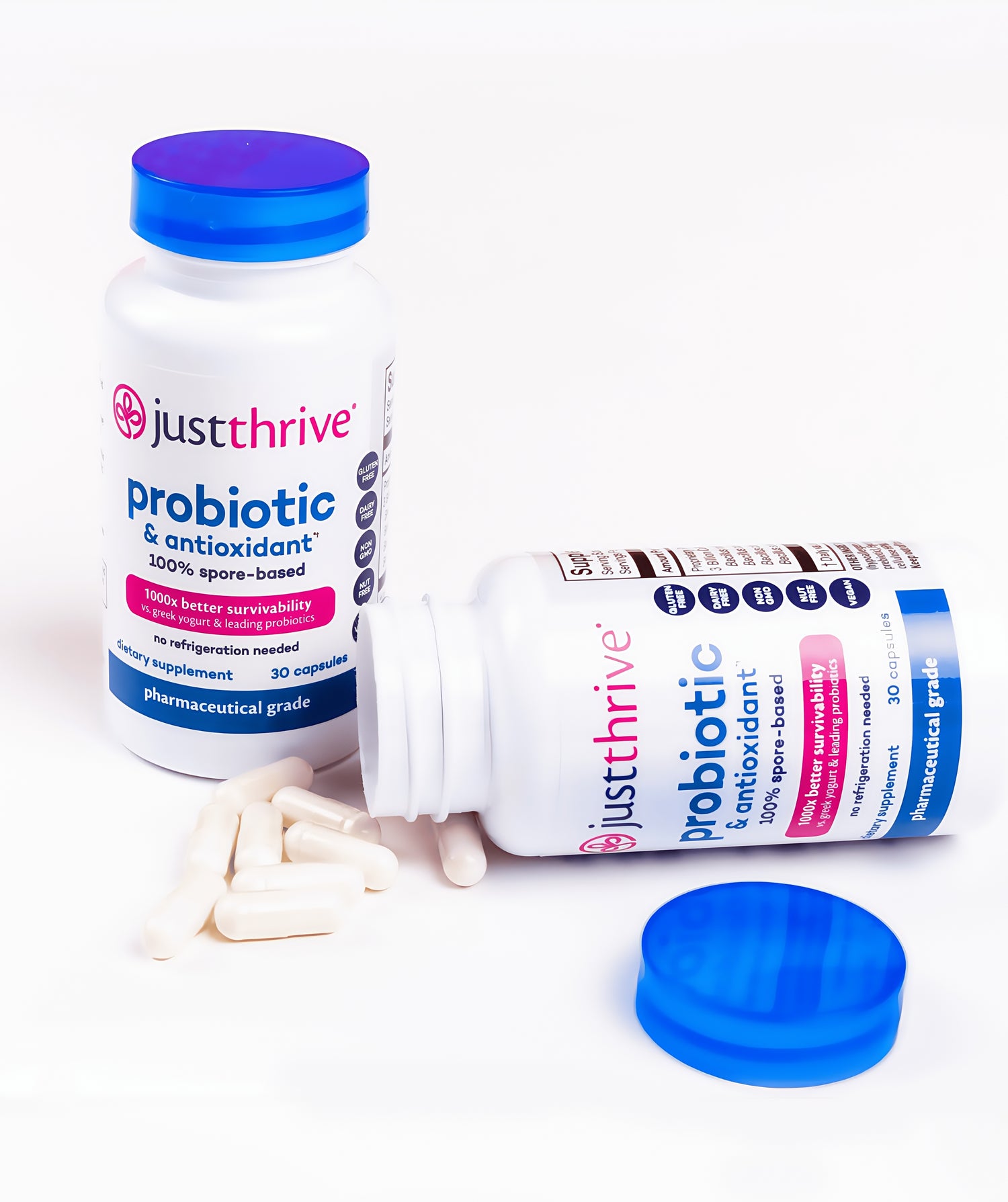 The Bacillus spores used in Just Thrive are a normal part of the human microflora — that means your body welcomes them home. They have been used medicinally in Europe for more than 50 years!